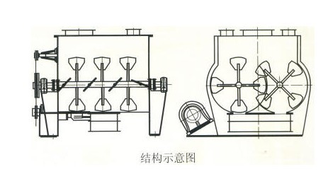 卧式双轴的等速反向旋转,轴上特殊布置的桨叶保证物径向、环向、轴向三项运动,形成复合循环、从而达到均匀混合。也可物化喷淋少量液体,满足不同的工艺要求。